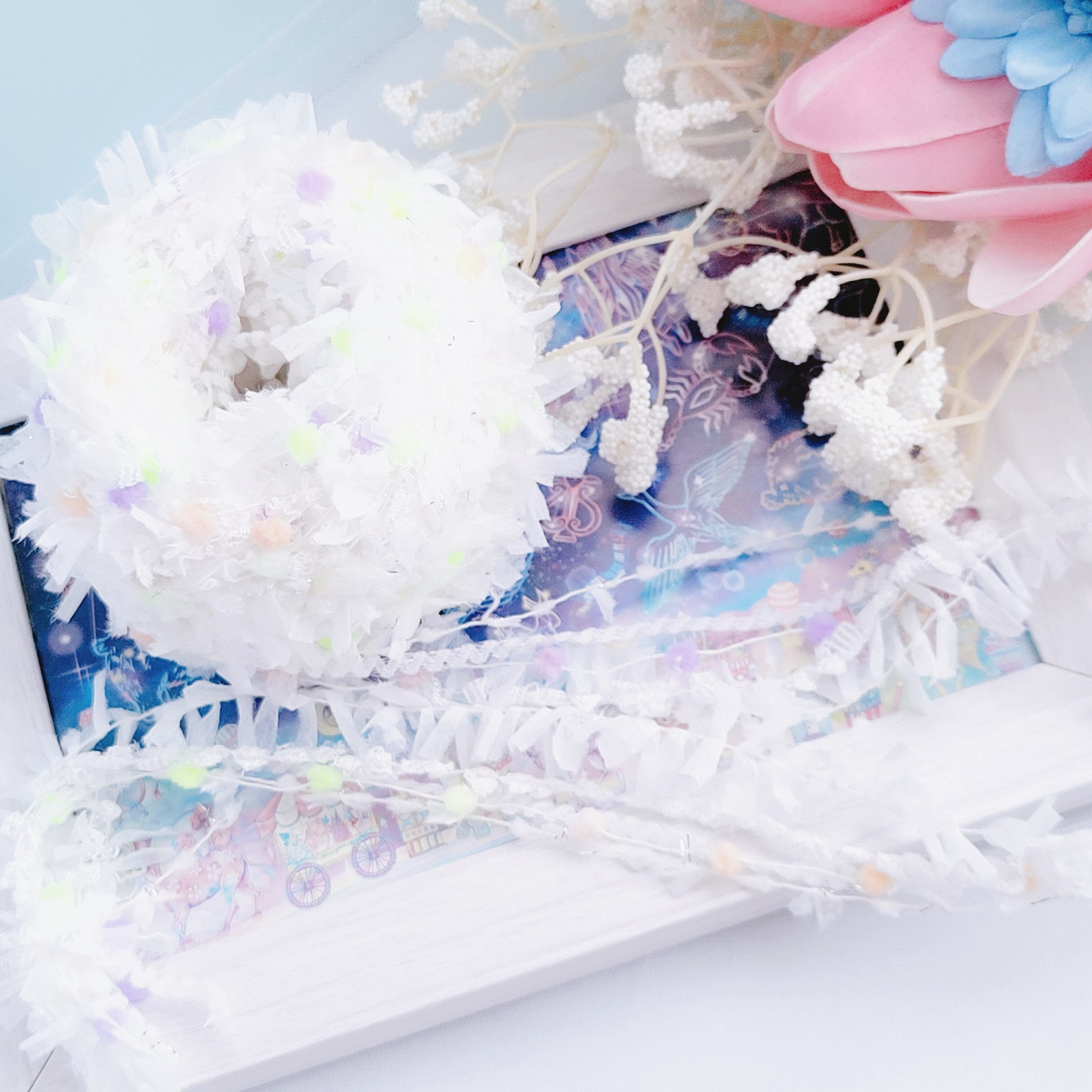 柔らかい白糸に、ぽんぽんやリボン、光る糸をほんのり添えて