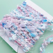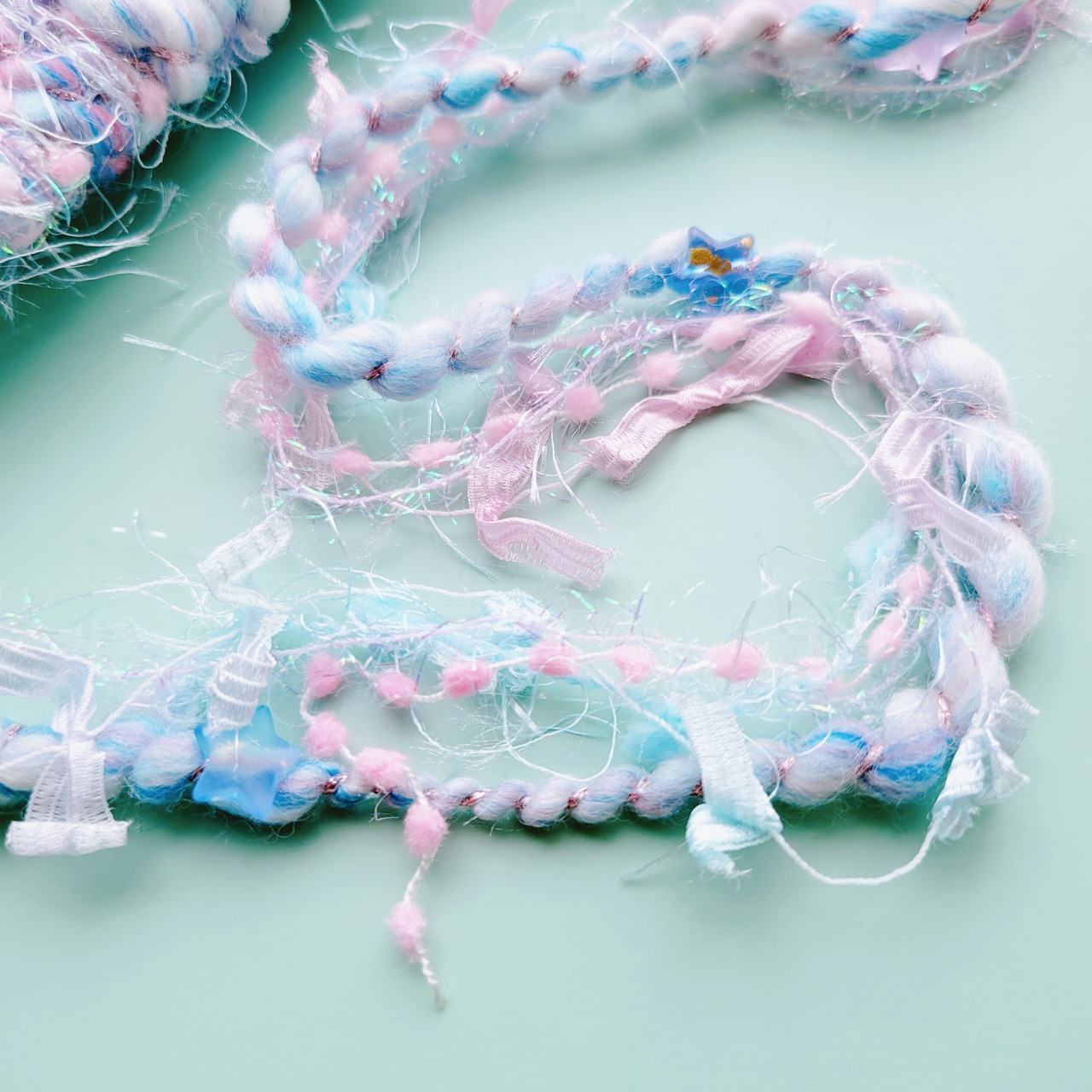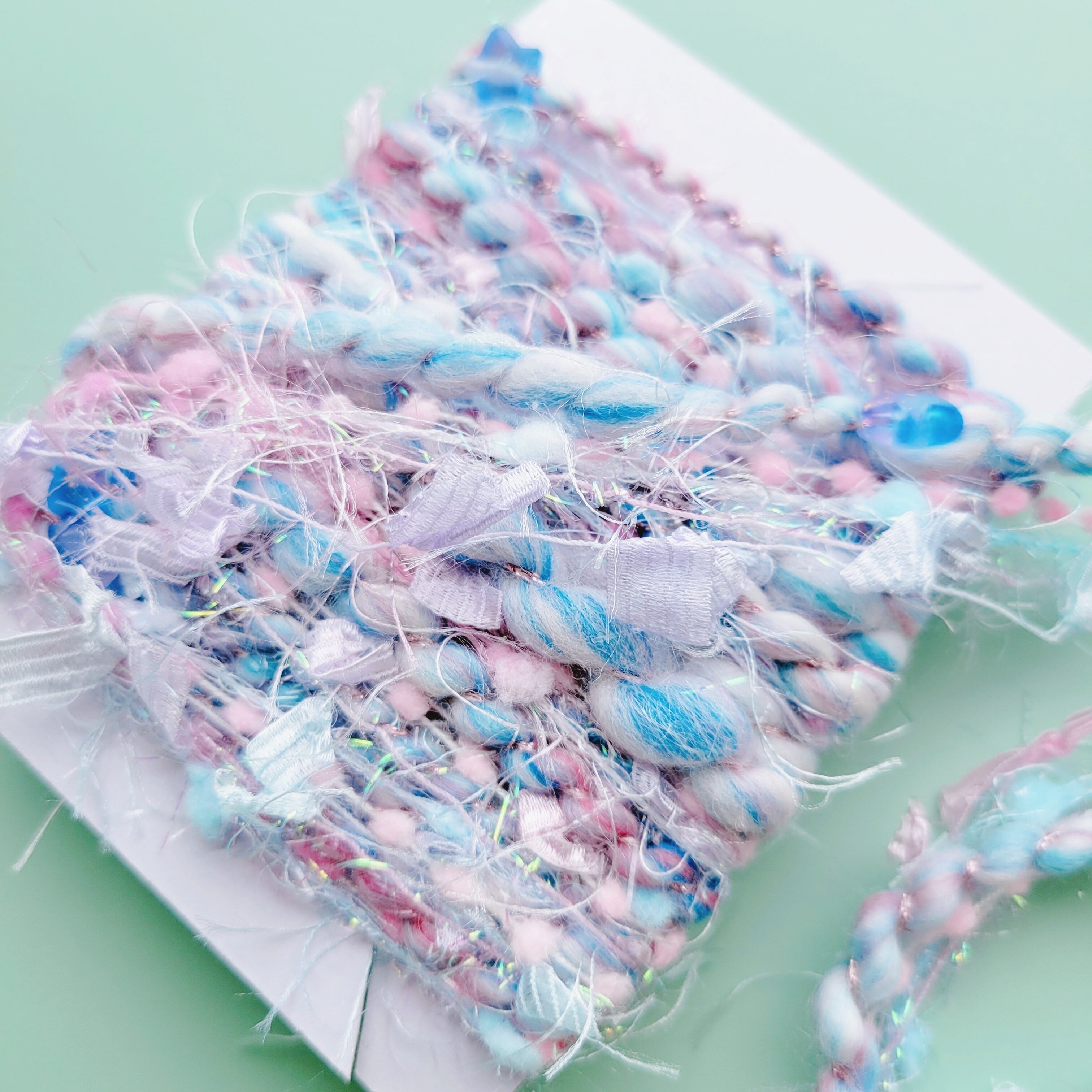 ふわふわのファンシーヤーンやリボン、ラメ糸などを合わせて、
