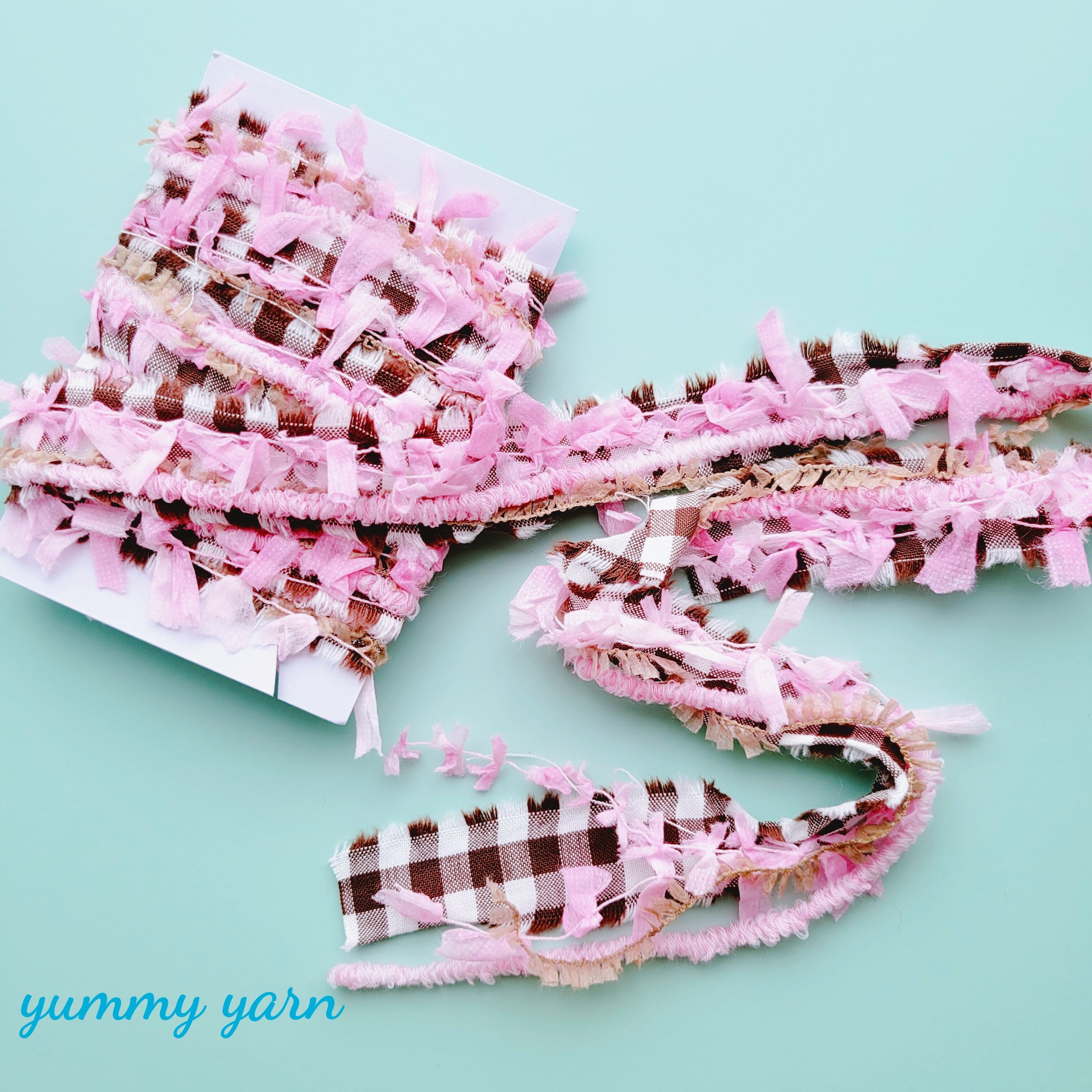 裂き布入り引き揃え糸(33)リプクロヤーン 3m ブラウンチェックピンク 手染め糸