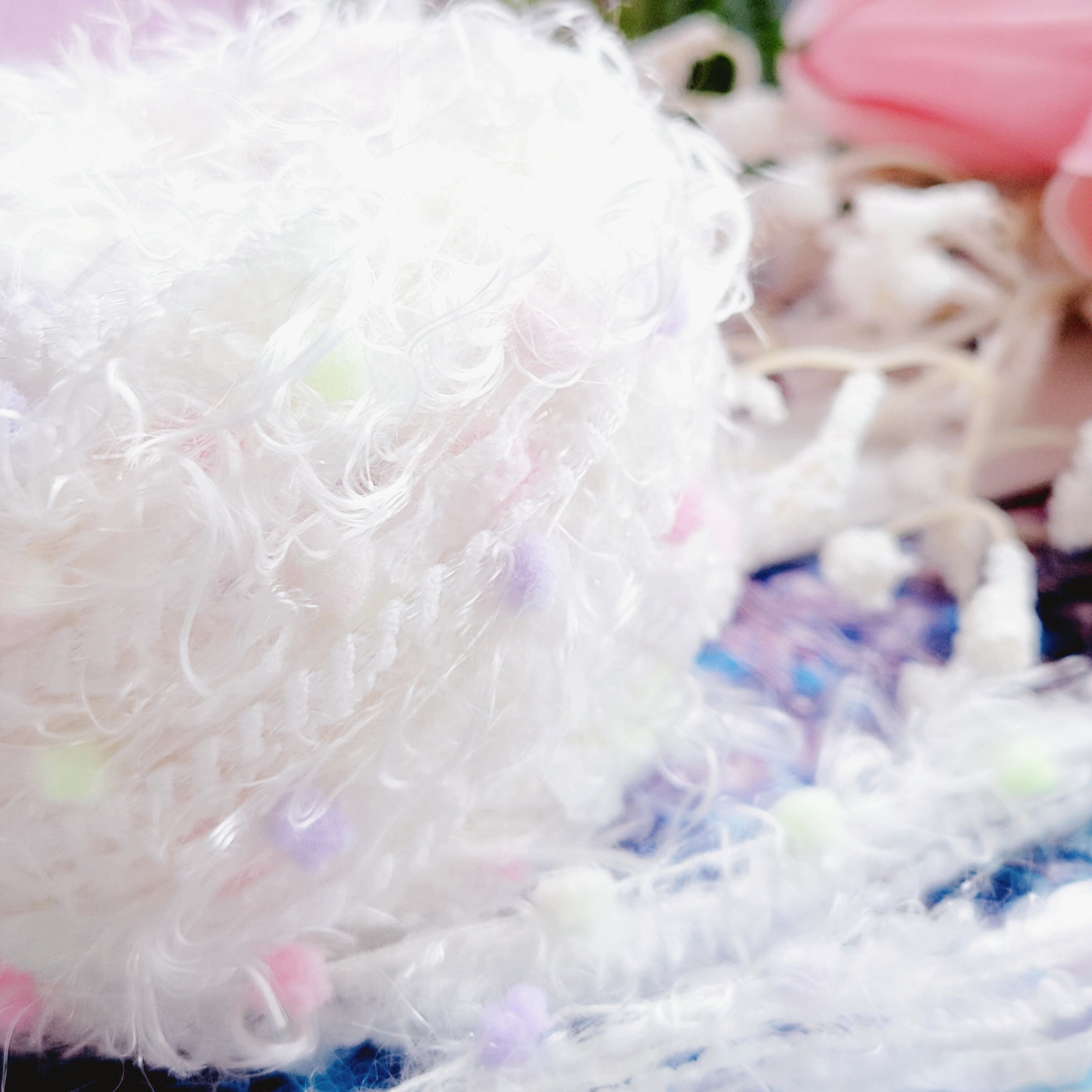 柔らかい白糸に、ぽんぽんやリボン、光る糸をほんのり添えて