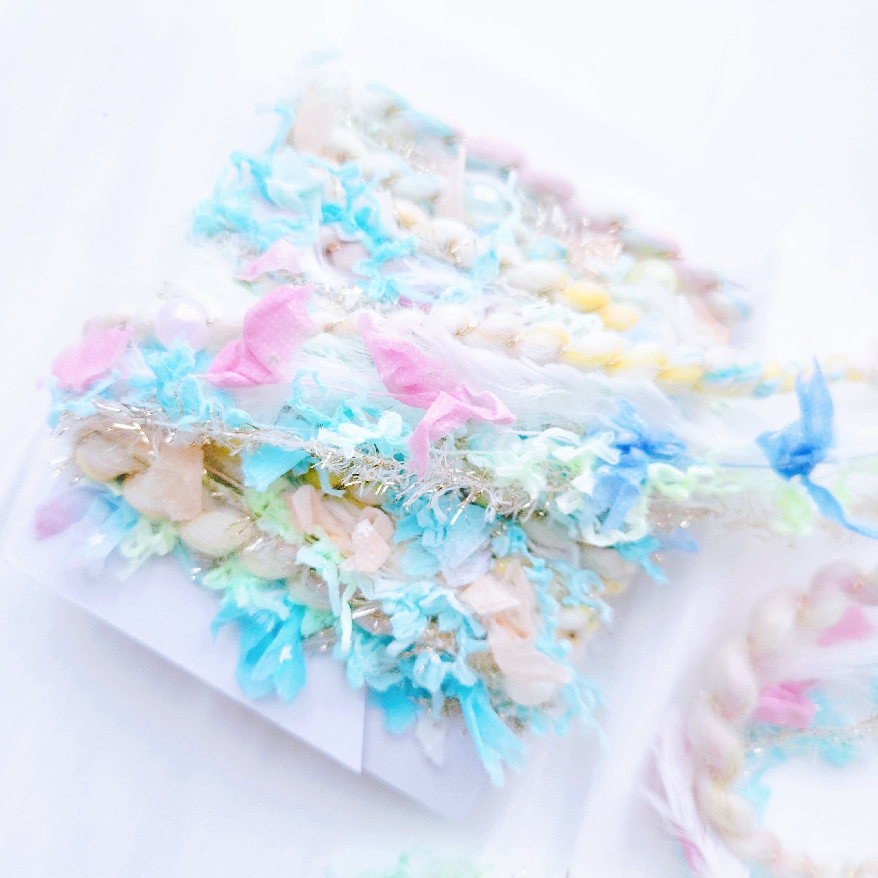 ふわふわのファンシーヤーンやリボン、ラメ糸などを合わせて、