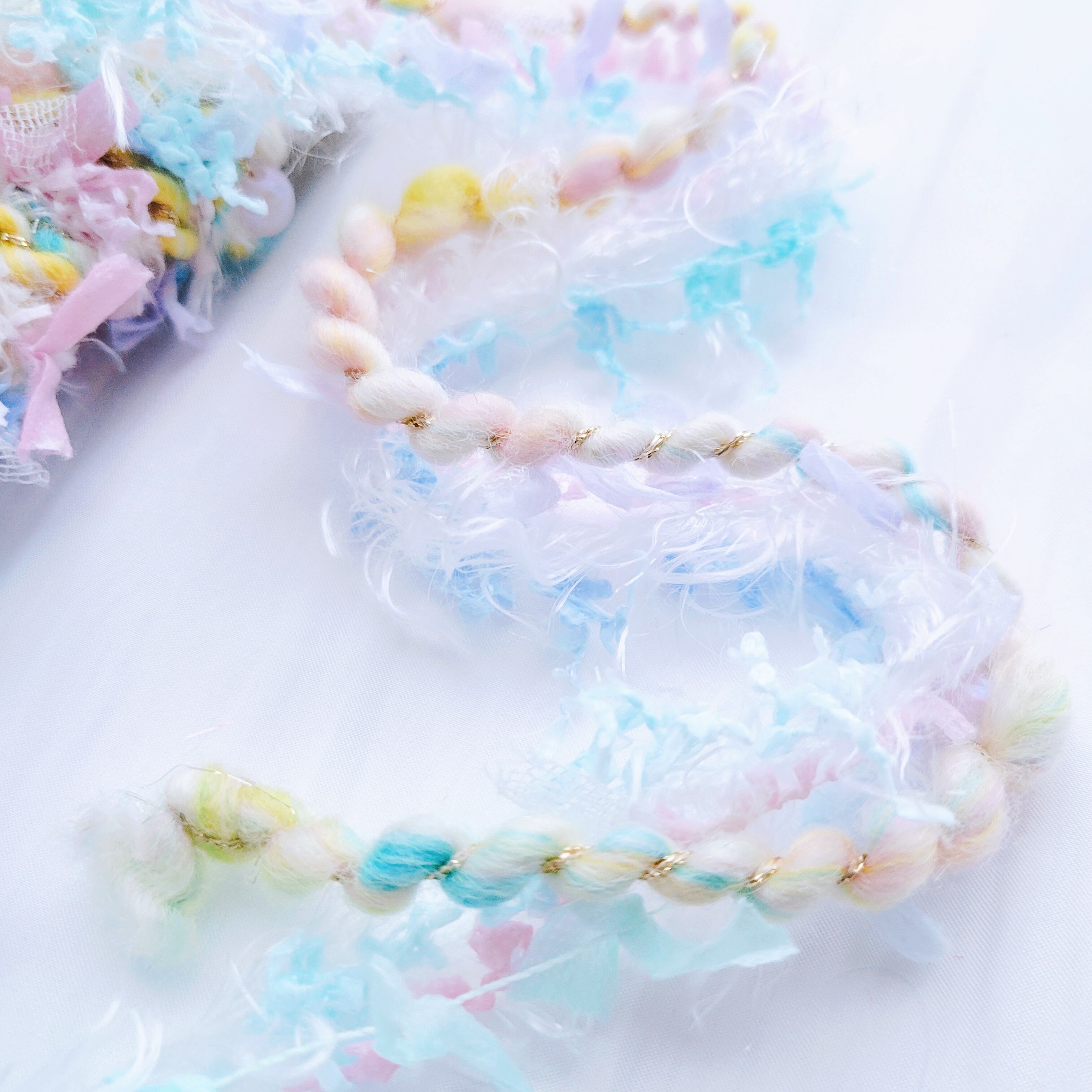 ふわふわのファンシーヤーンやリボン、ラメ糸などを合わせて、