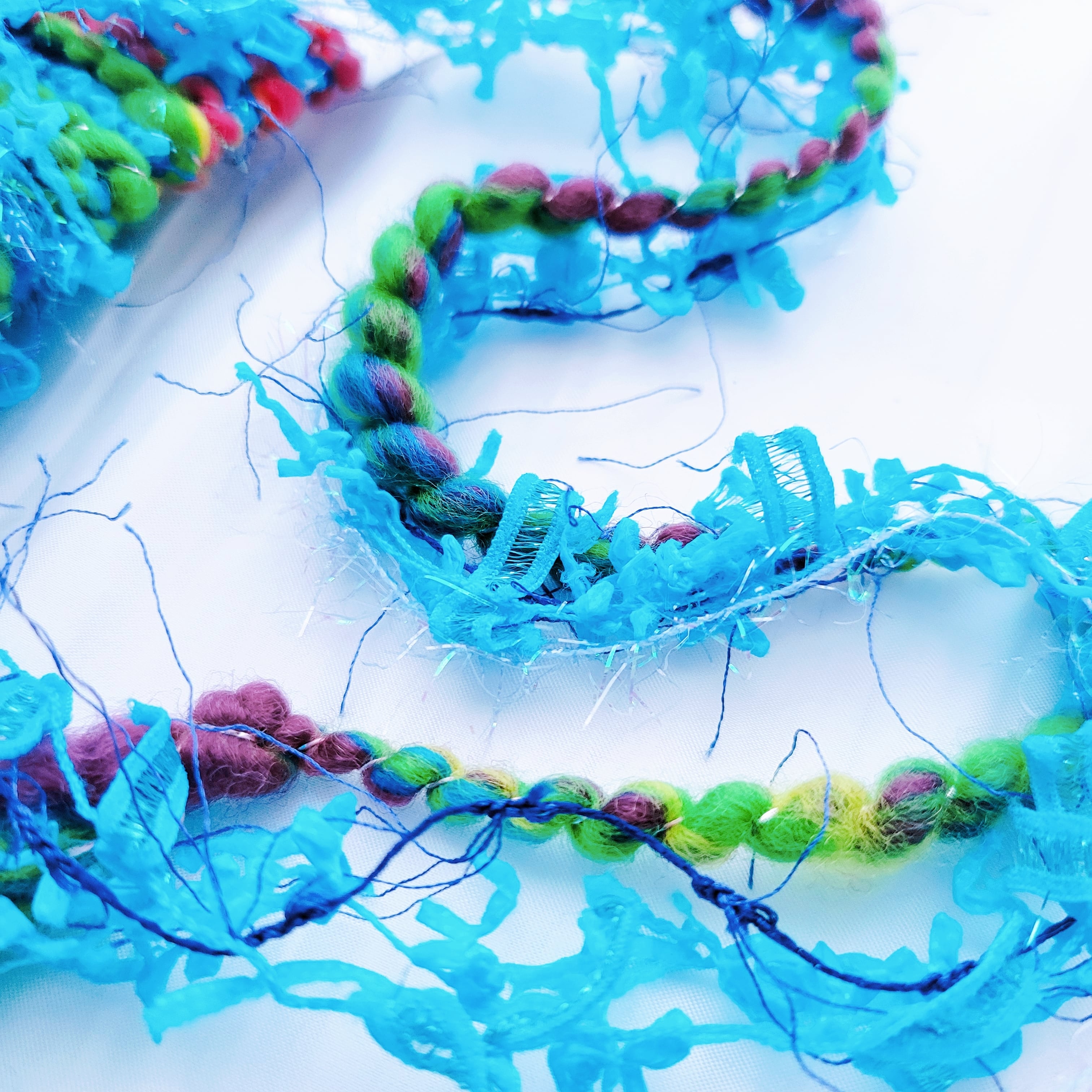 ビーズ入りの手紡ぎ糸を主役に、さまざまな素材を重ねた