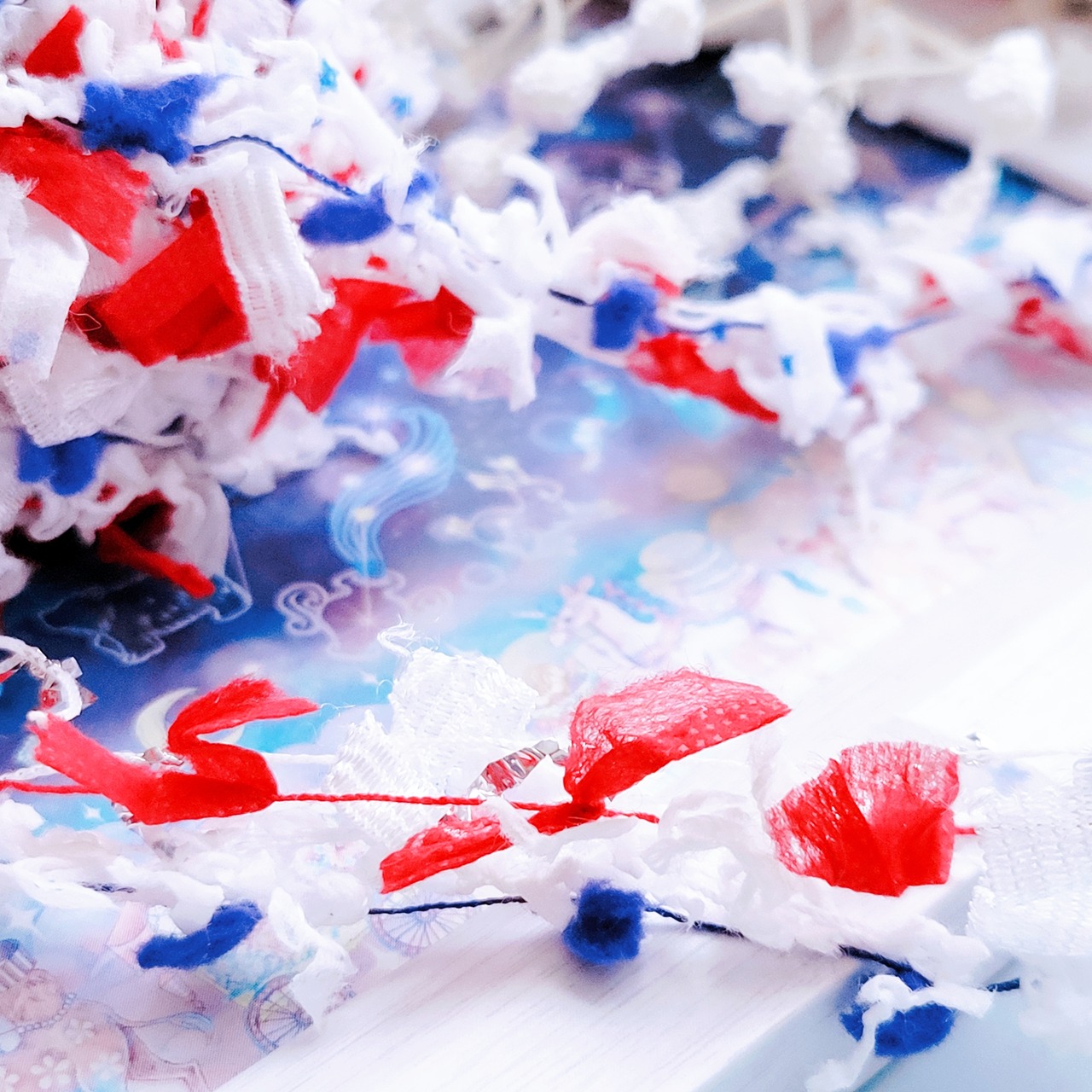 素材:チュール、ラメ糸、レース、リボン、段染め糸 など