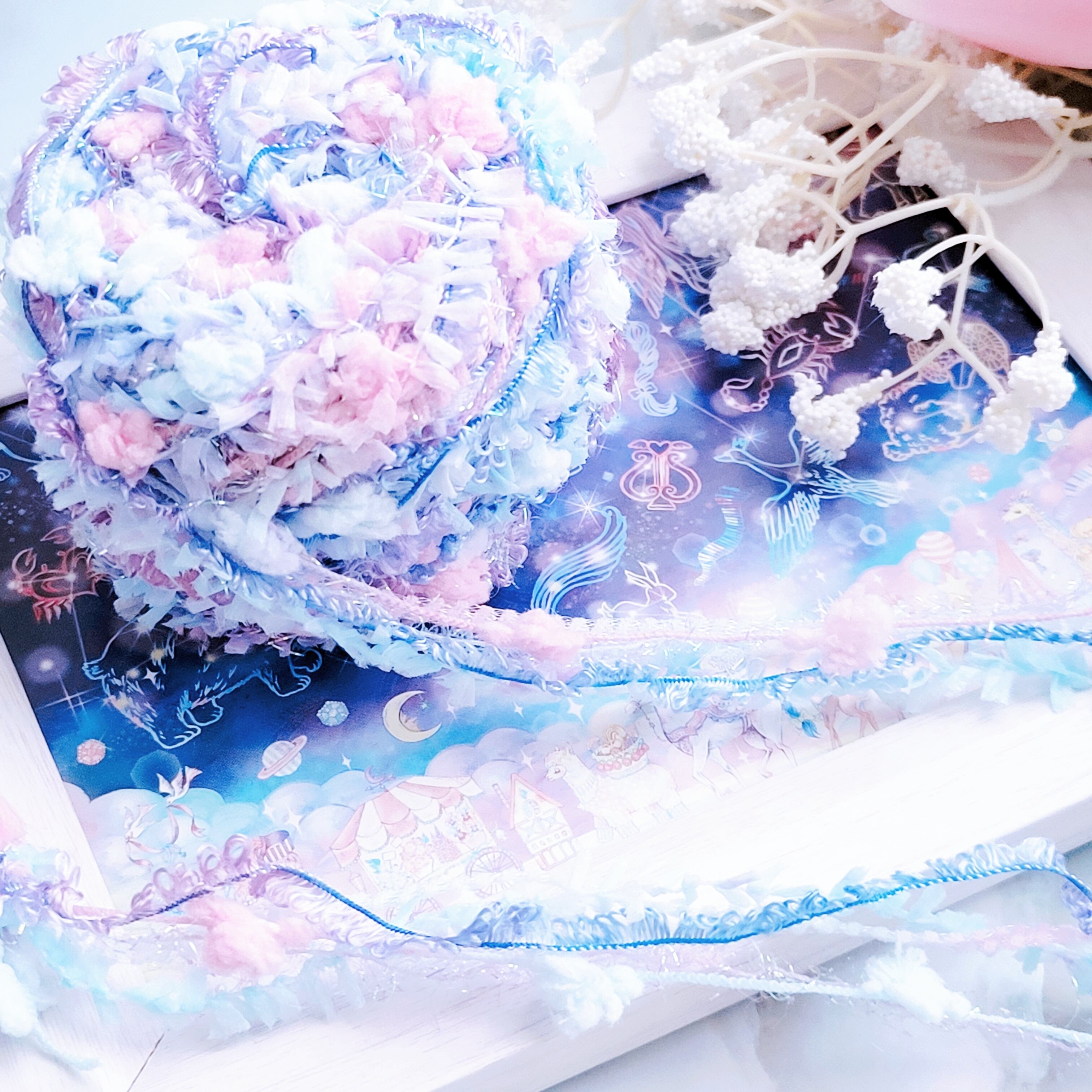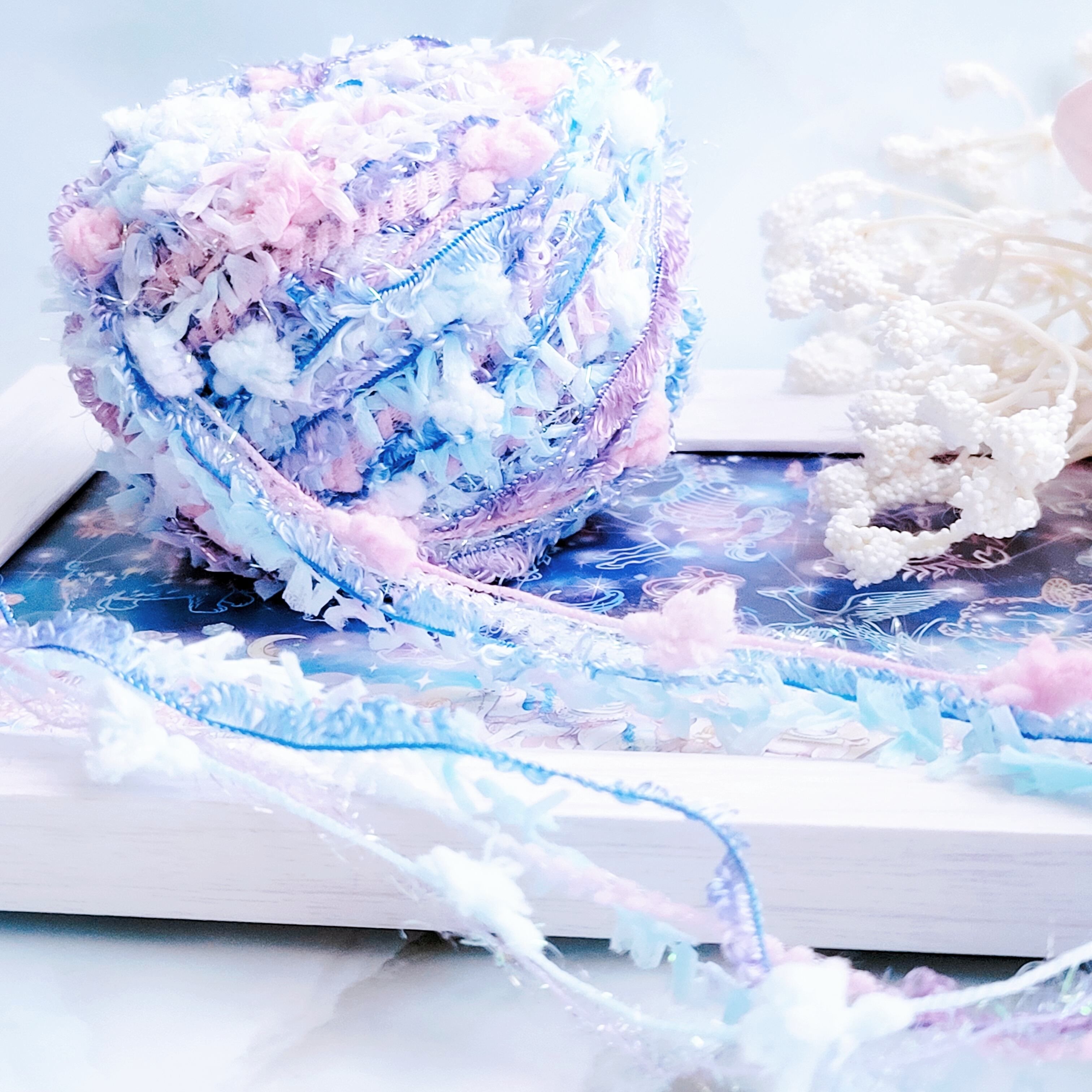淡いブルーとピンクがふわっと溶け合う、雲のようなやさしいループヤーン。