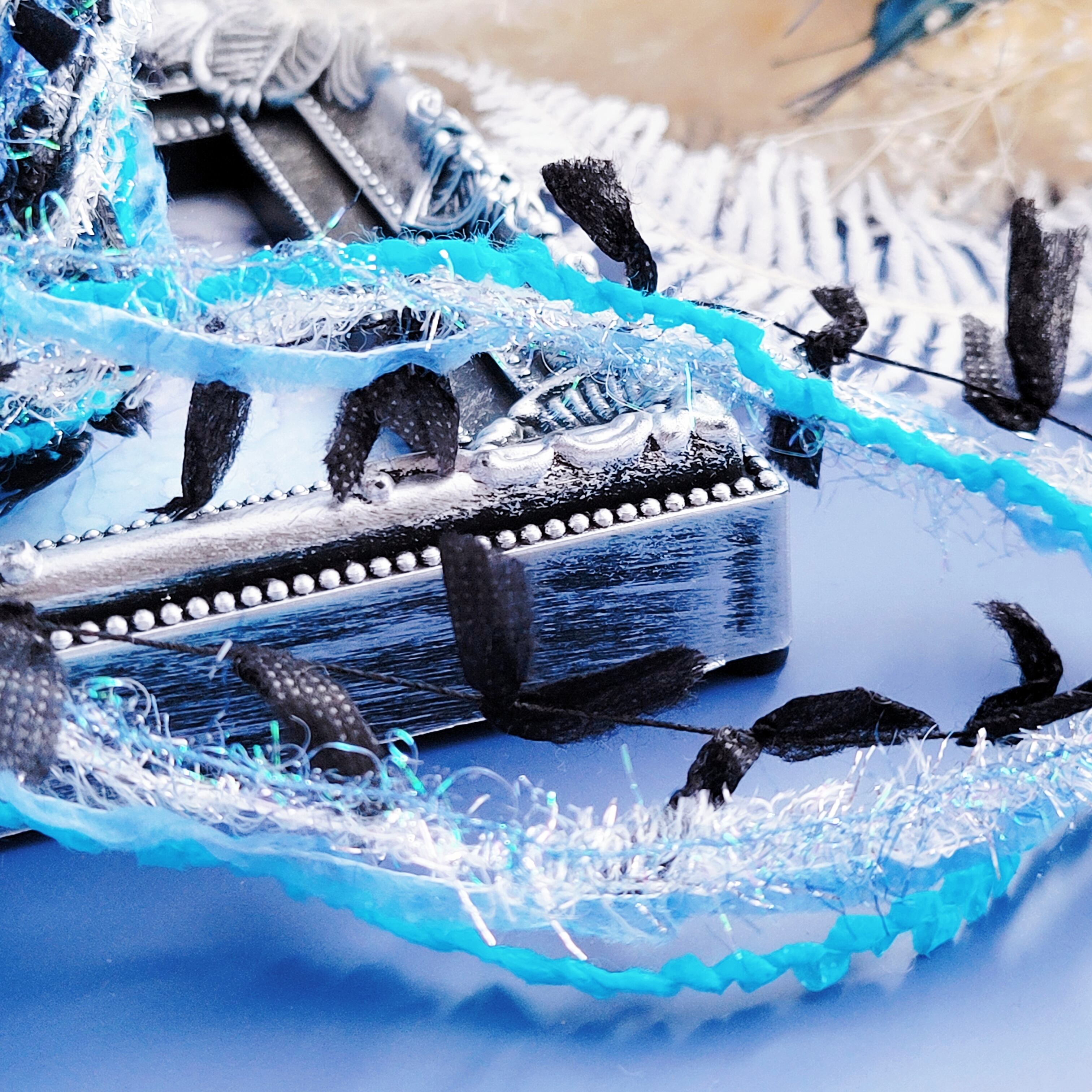 ブラックとシルバーがアクセントとなり、作品に深い陰影と幻想のきらめきを添えます。